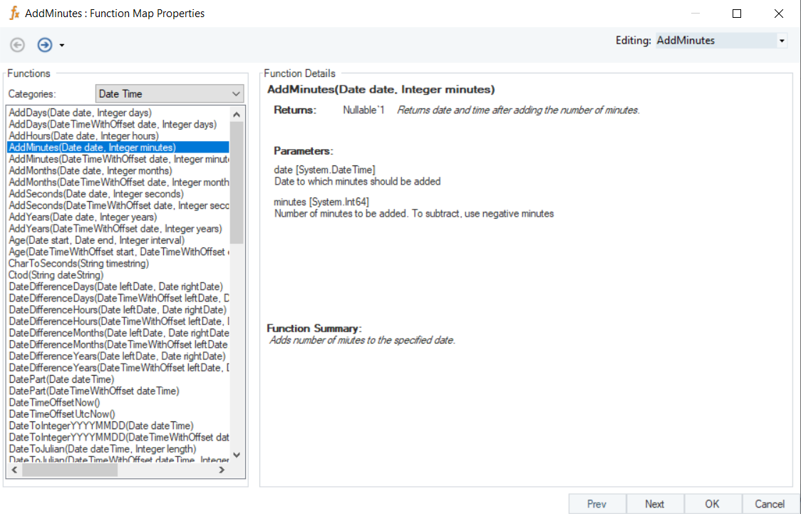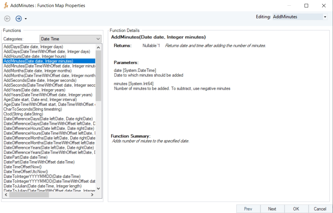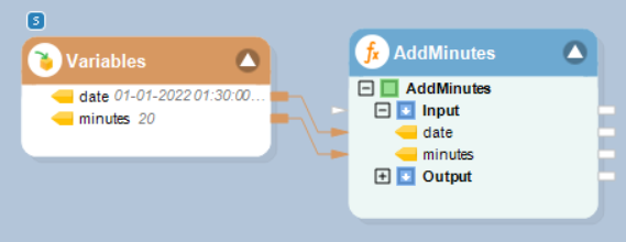 In this example, we will pass a date time value, and an integer value (indicating minutes to be added or subtracted) to the function transformation object using a Variables object.