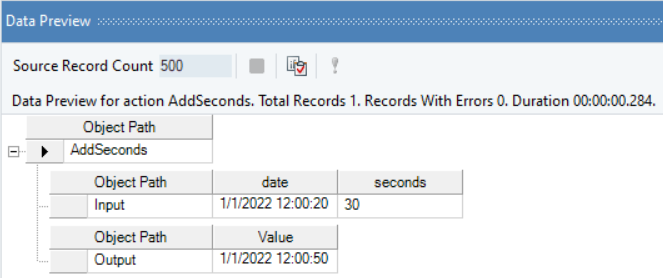 In this example, we will pass a date time value, and an integer value (indicating seconds to be added or subtracted) to the function transformation object using a Variables object.