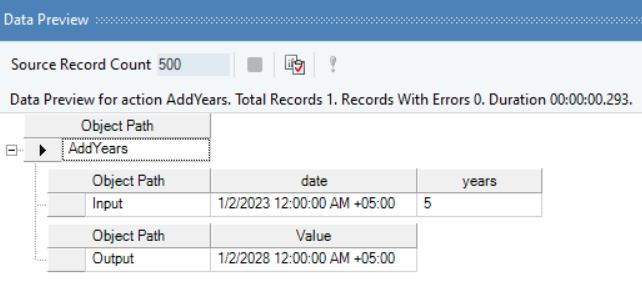 In this example, we will pass a date time offset value, and an integer value (indicating years to be added or subtracted) to the function transformation object using a Variables object.