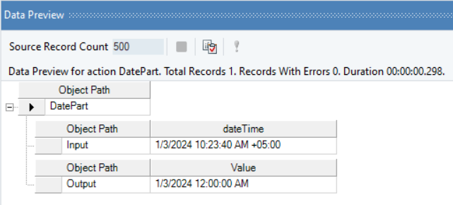 In the output window, you can see that the provided date-time value has been returned with the time-offset part reset to 12:00:00 AM.