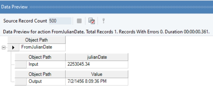 In the output window you can see that the specified Julian date has been converted into a date time value.