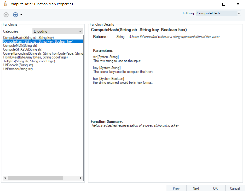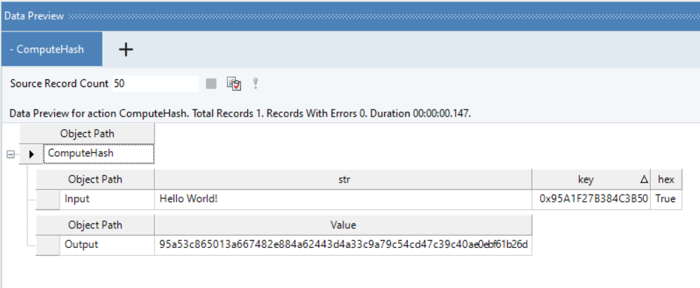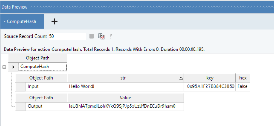 Right-click on the function transformation object and select Preview Output. You can see that the tool has returned the hexadecimal hashed value of the specified string, using the specified key value.