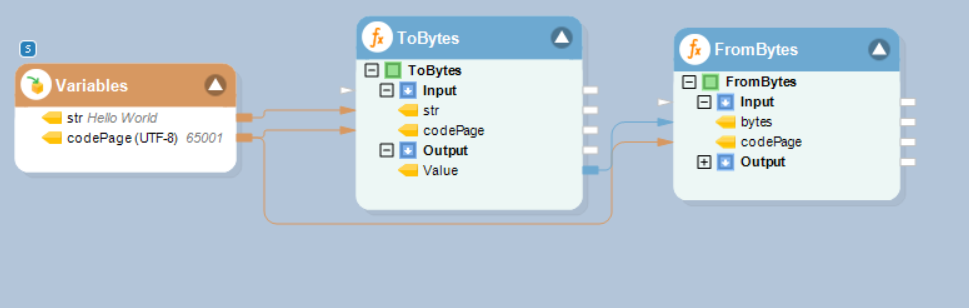 Note: The Value is the output value (bytes) from the ToBytes function transformation object, where a string value, “Hello World”, has been converted into a byte array.