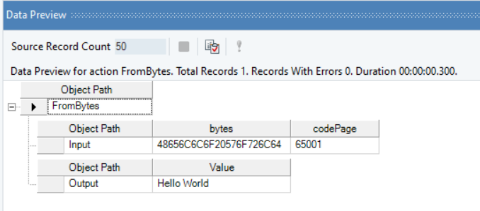 Right-click on the FromBytes function transformation object and select Preview Output. You can see that Astera has returned a string value after successfully converting the provided byte array.