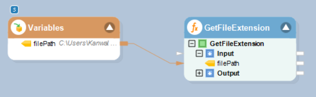 In this example, we are passing the required parameter to the function transformation object using a Variables object. We will be defining the file path of the file for which we want to extract the extension.