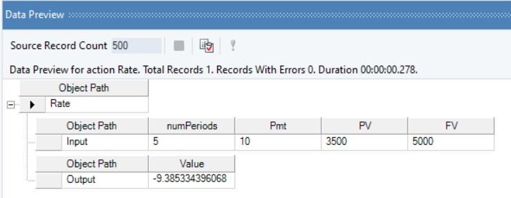 Right-click on the function transformation object and select Preview Output. You can see that Astera Data Stack has applied the Rate function, and returned the Interest rate value, while also considering the future value.
