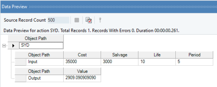 Right-click on the function transformation object and select Preview Output. You can see that Astera Data Stack has applied the SYD function, and returned the sum-of-years depreciation value.