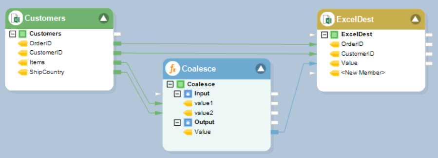 Right-click on the Excel Workbook Destination object and select Preview Output. You can see that Astera Data Stack has created a new column, and returned a value from either Items (value1), ShipCountry (value2), or null (if both specified parameters are null), in this particular order.