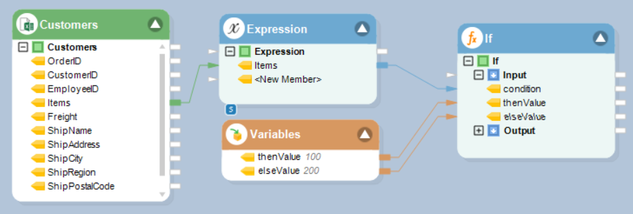 In this example we will use the *Expression* object to define the condition, and a *Variables* object to define *thenValue* and *elseValue*.