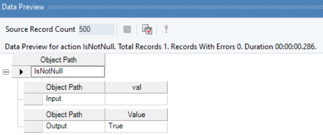 In the output, you can see that the Boolean value, True, has been returned. This means the provided value is NOT null. There is data present in the *Input* field.