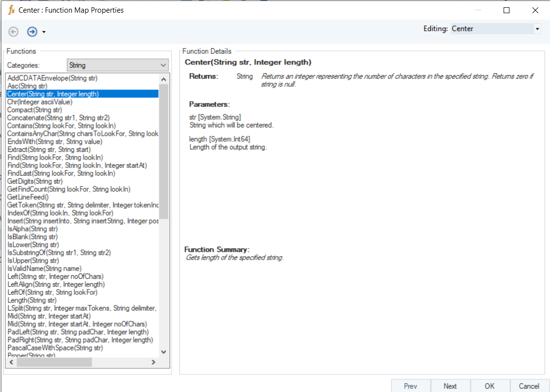 | Syntax      | Center (String str, Integer length)                                                                                    |