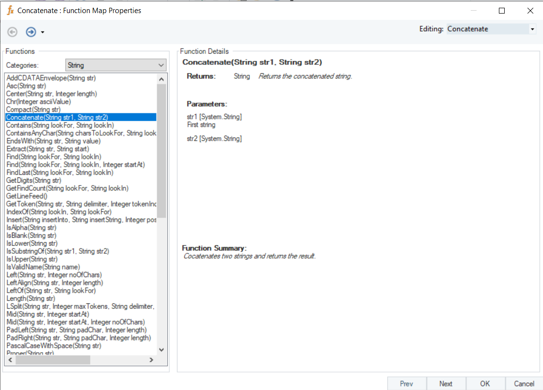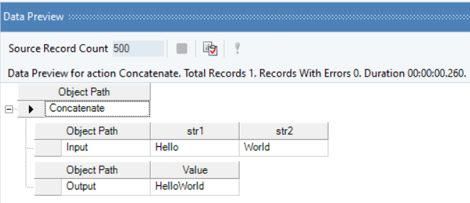Right-click on the function transformation object and select Preview Output. You can see that Astera Data Stack has returned the a concatenated string using variables str1 and str2.