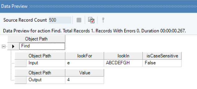Right-click on the function transformation object and select Preview Output. You can see that Astera Data Stack has returned the integer value “4”, indicating that the lookFor value’s positional integer value in the lookIn string is “4”.