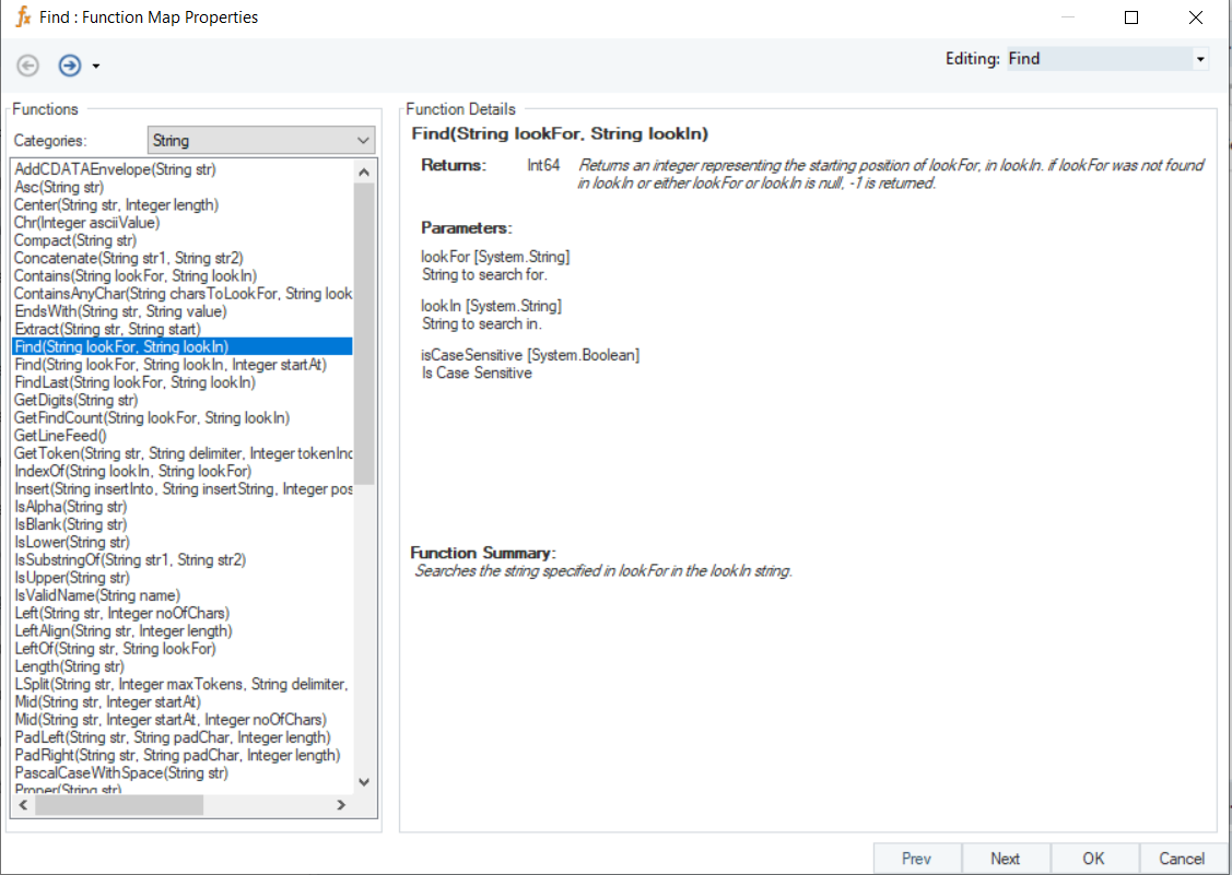 Returns an integer representing the starting position of lookFor, in lookIn. If lookFor was not found in lookIn or either lookFor or lookIn is null, -1 Is returned. Note: Counting is started with the integer value, “0”