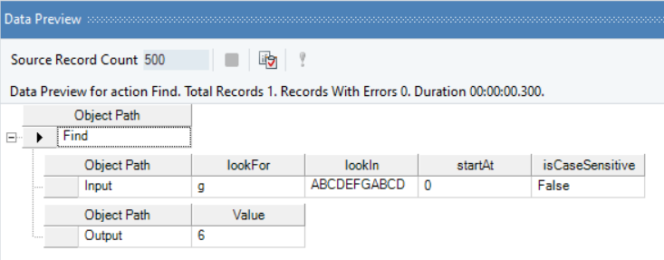 Right-click on the function transformation object and select Preview Output. You can see that Astera Data Stack has returned the integer value “13”, indicating that the lookFor value’s positional integer value in the lookIn string is “13”. Note that since the specified starting position is “7”, the intital lookFor value, “g”, in position “6”, has been ignored.