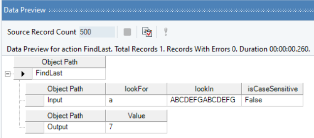 Right-click on the function transformation object and select Preview Output. You can see that Astera Data Stack has returned the integer value “7”, indicating that last occurrence of the lookFor value was in the integer position, “7”.