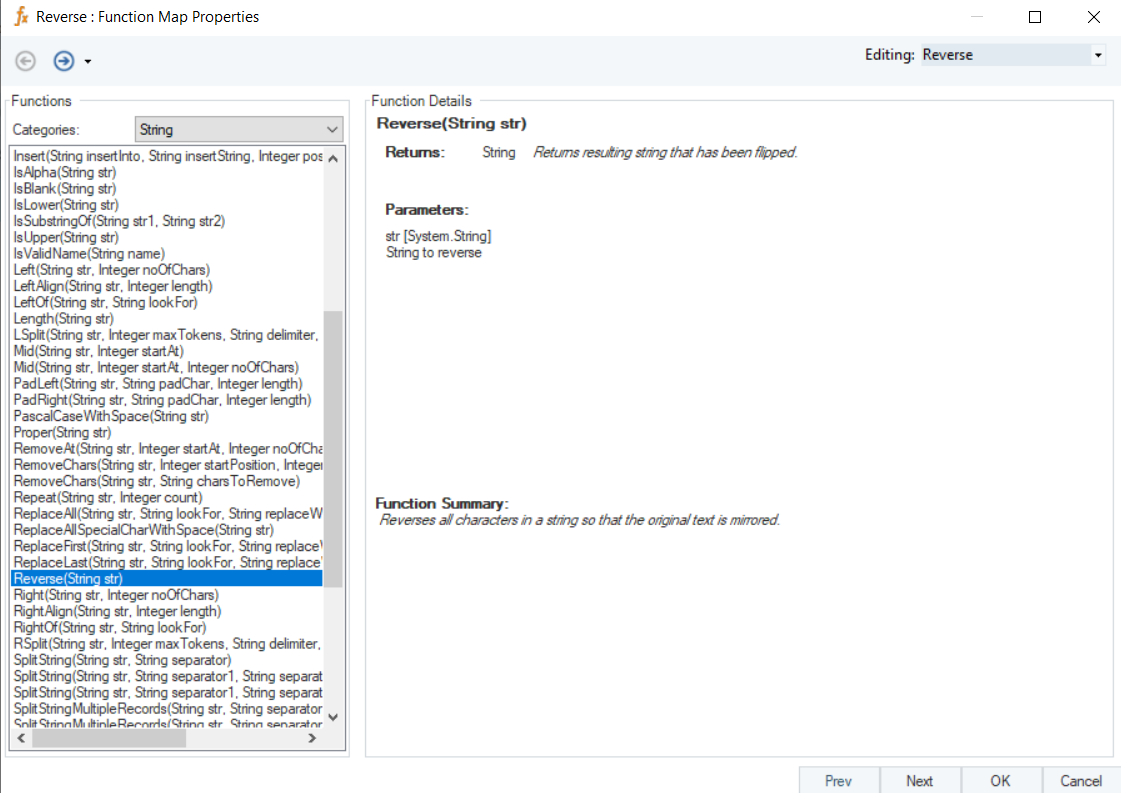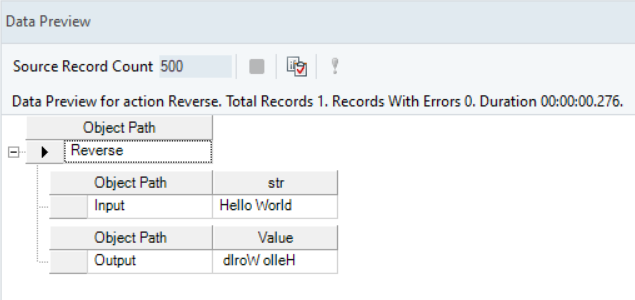 Right-click on the function transformation object and select Preview Output. You can see that Astera Data Stack has returned the mirrored string in the output.