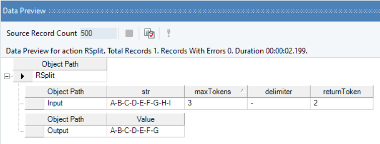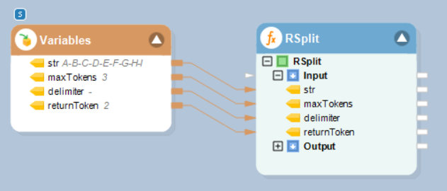 To split a string into chunks, specified by an integer value of a ‘maxTokens’ variable, and delimited by a ‘delimiter’ string value. Returns specified token at index ‘returnToken’, counting from the right. (Note: The integer value, 0, will return the first split chunk)