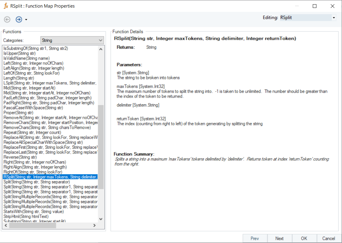 RSplit (String str, Integer maxTokens, String delimiter, Integer returnToken)