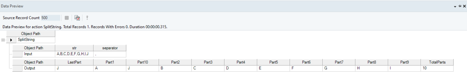 Right-click on the function transformation object and select Preview Output. You can see that Astera Data Stack has returned the split string.