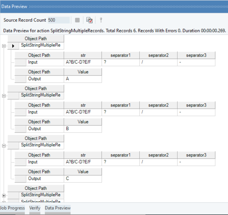 Right-click on the function transformation object and select Preview Output. You can see that Astera Data Stack has returned the different parts of the split string as separate records, on the basis of the specified delimiter (separator) values.