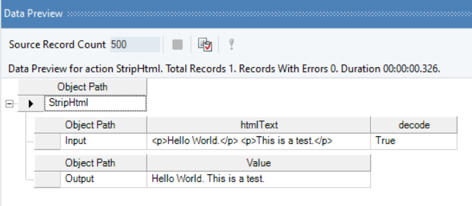Right-click on the function transformation object and select Preview Output. You can see that Astera Data Stack has returned a string values, stripped of HTML tags.