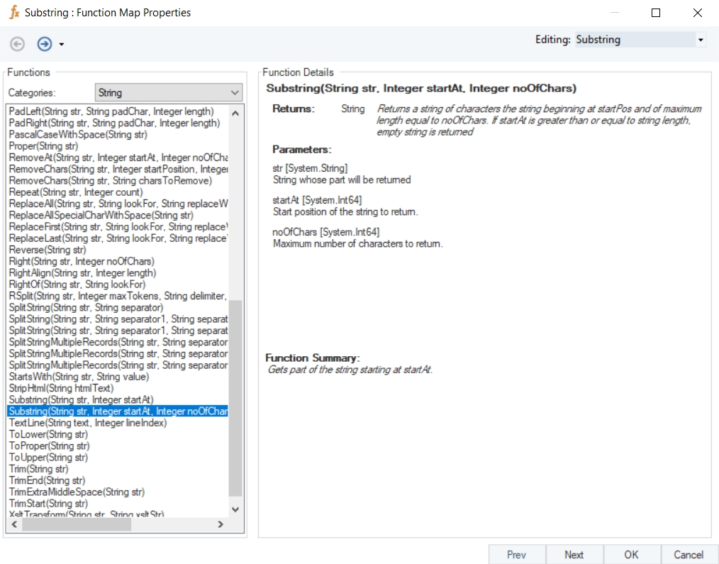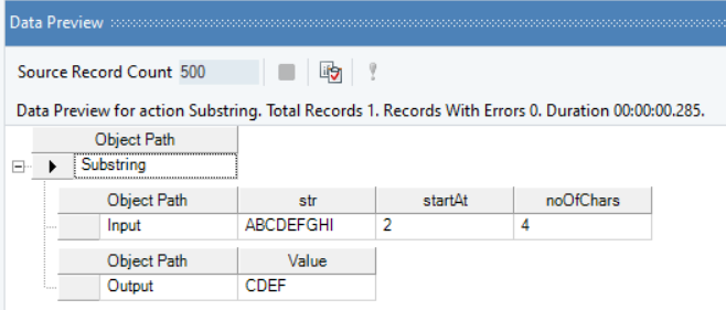 Right-click on the function transformation object and select Preview Output. You can see that Astera Data Stack has returned a part of the string, starting at position startAt, and of length, noOfChars.