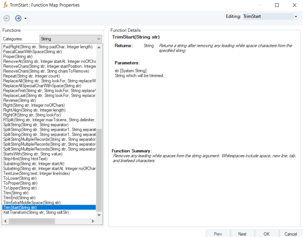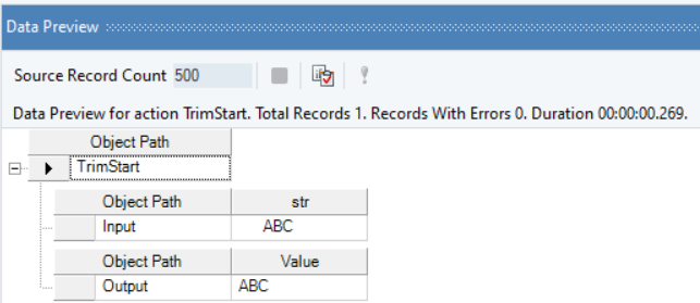 Right-click on the function transformation object and select Preview Output. You can see that Astera Data Stack has returned a string value, with trimmed leading whitespace characters.