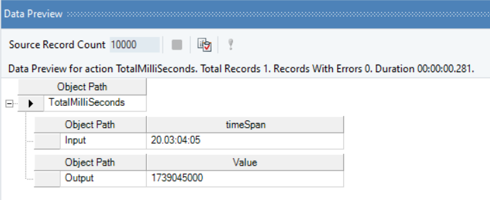 In the output window, you can see that the timespan value has been converted into a real value, indicating the total number of milliseconds present in the timespan value.