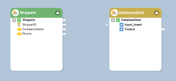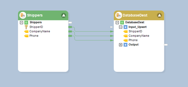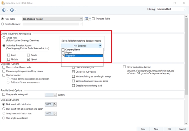 Next in the Define Input Ports for Mapping section select the Individual Ports for Actions and then further select the Upsert checkbox as we require new entries to be stored in the destination. In the Select Fields for Matching Database Record select the ShipperID which is also the primary key and is unique for each record in our database table.