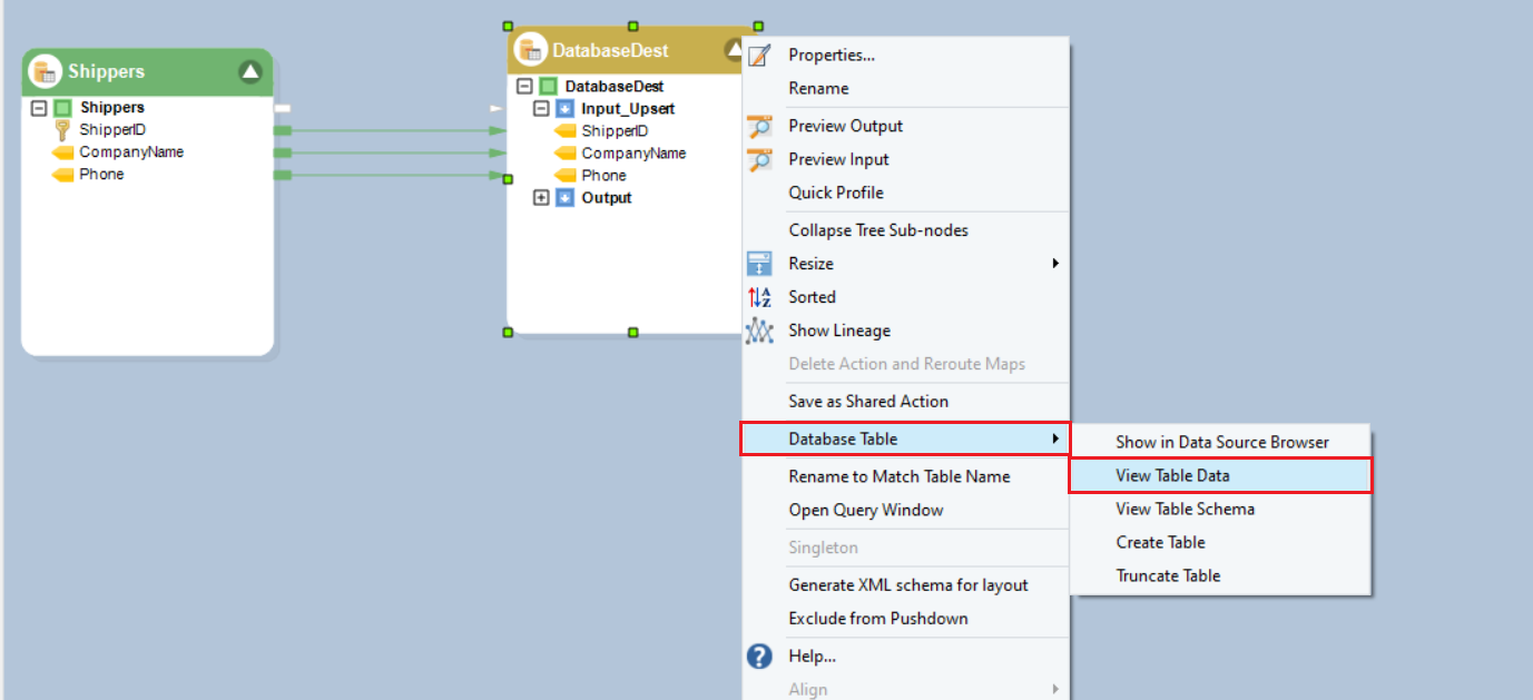 Now, you can check the destination table and find it to be empty. To check a database table’s contents in Astera, right-click on the object, in this case DatabaseDestination.