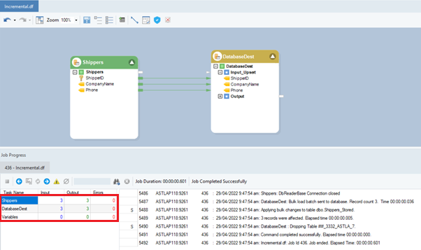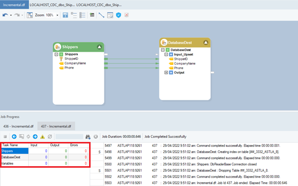 Upon running the dataflow, you can see in the Job Progress that the database table source object has not registered any data and therefore the destination is not updated. The update is not considered, as the value of the Audit Field in this case, ShipperID stored in the CDC file is the same as it was in the last run.