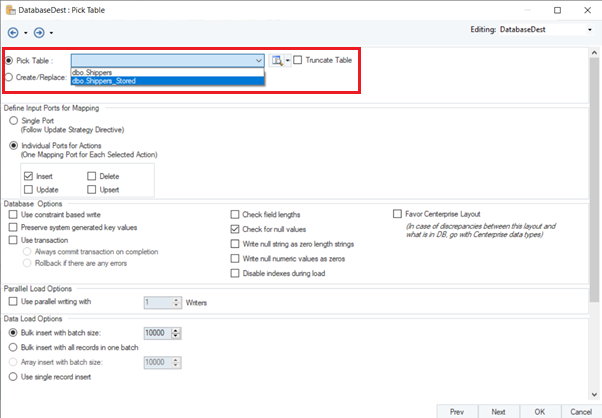 In our case, the table is already present in our database, and we can select it from the Pick Table window. We pick the Shippers_Stored table as our destination table.