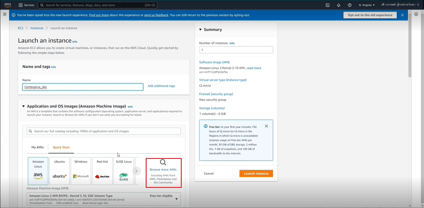 You are now redirected to a configurations page for the virtual machine instance you want to create. Rename the launched instance and browse for AMIs.