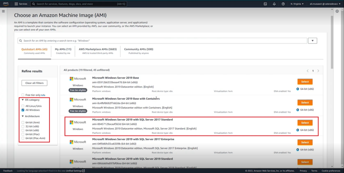 You can browse for your desired AMIs using the filters provided. In our case, we will be selecting a windows server with SQL installed for Astera.