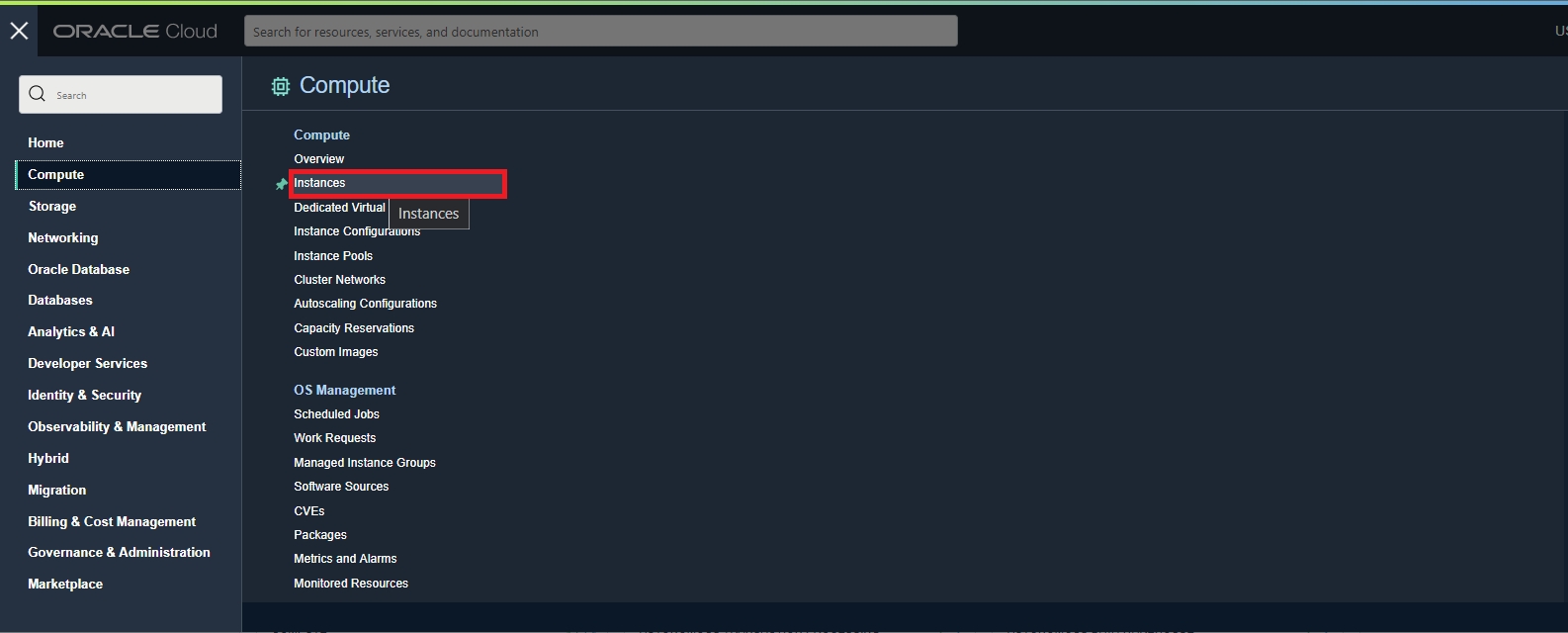 Click on the three lines next to the search bar located at the top, select Compute, and then click Instances.