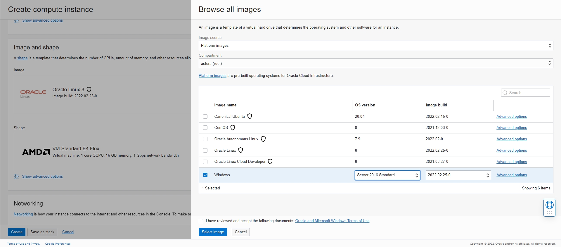 For Version, select the default value and for Compartment, select astera (root).