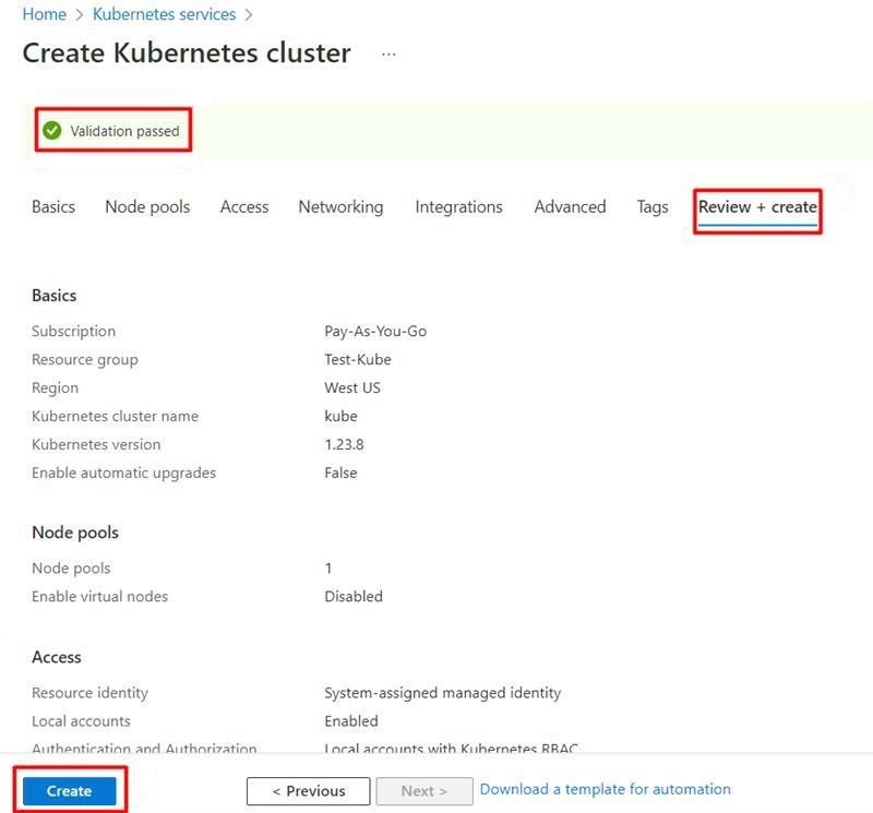 Now go to the Review + Create Tab to validate the options chosen. Once validated, click on Create to start deployment for the AKS cluster.
