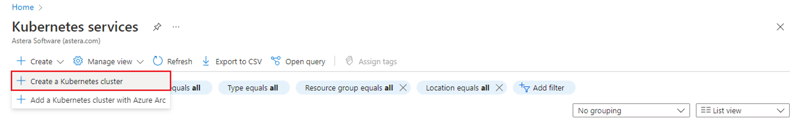 Go to your Azure Organization portal to set up AKS for the Astera Server.