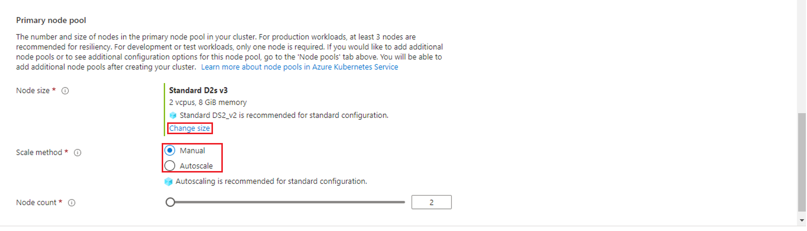 Select the primary node pool’s Node Size, and Scale Method as described below.
