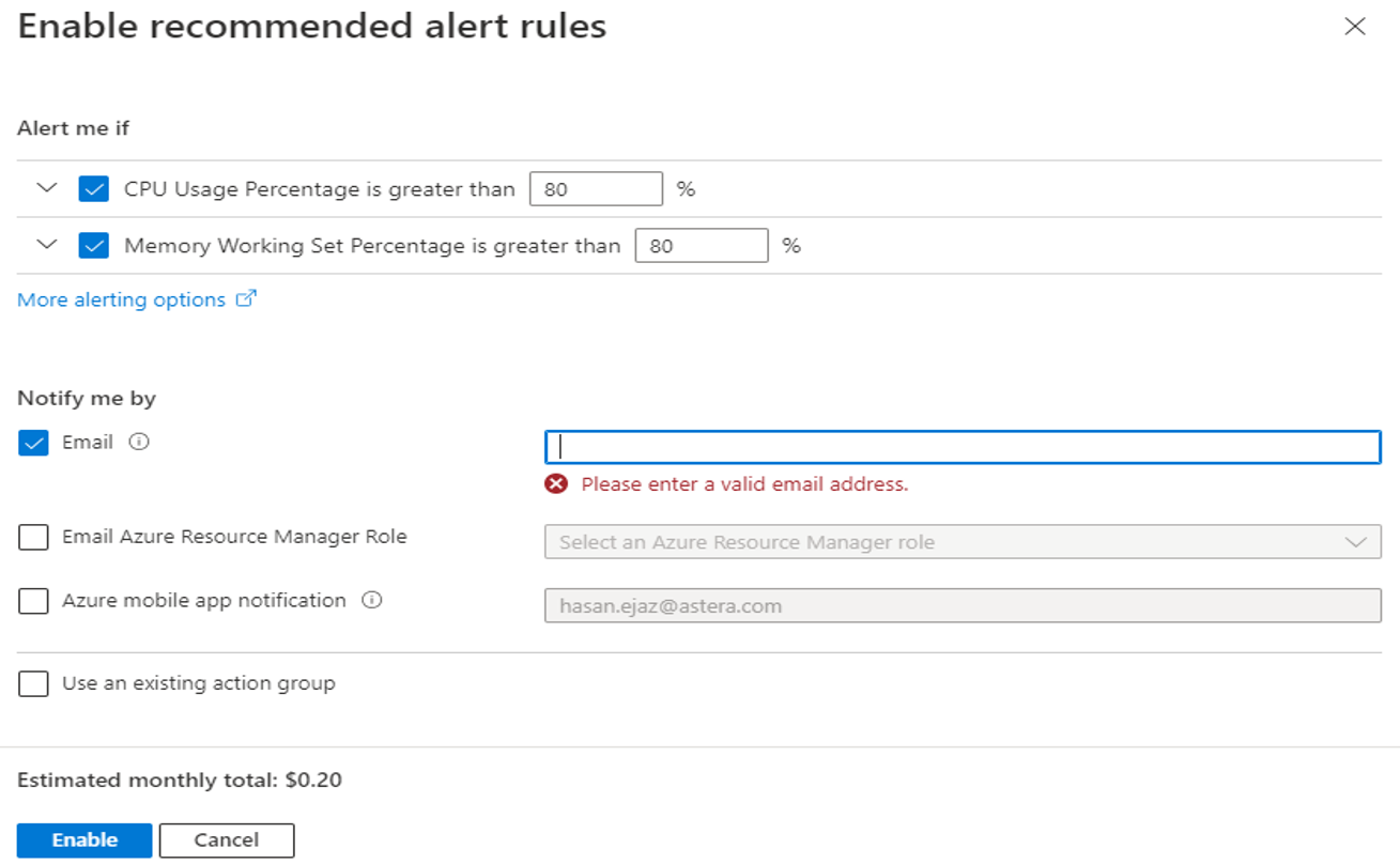 You may customize the alert settings depending on your requirements and provide an email to receive the alerts. Once configured select Enable.