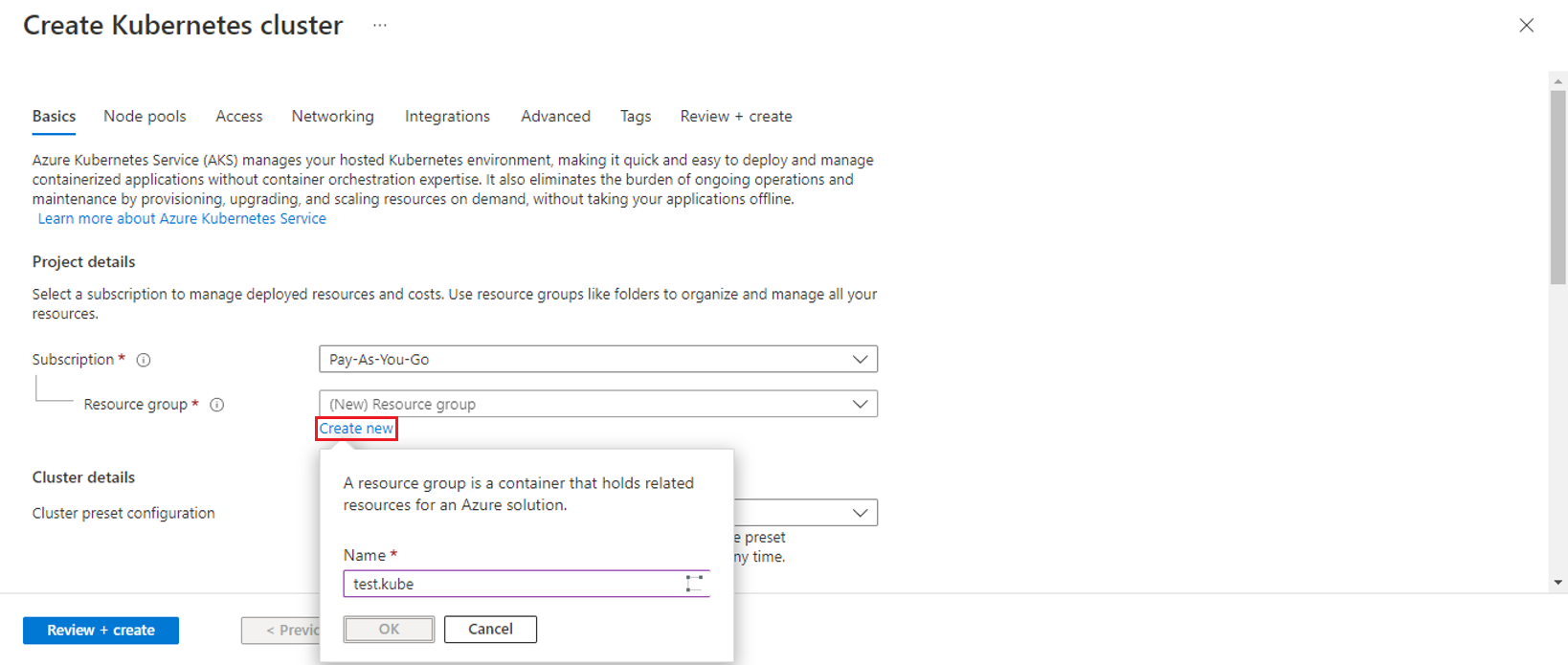 While creating the AKS cluster, create a new Resource group by clicking on the Create new option below the drop-down for the Resource group.