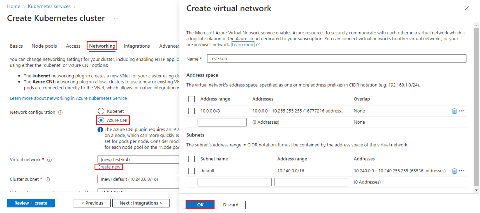 Create a New virtual Network by selecting the Create New option and set the properties as illustrated below and click OK.