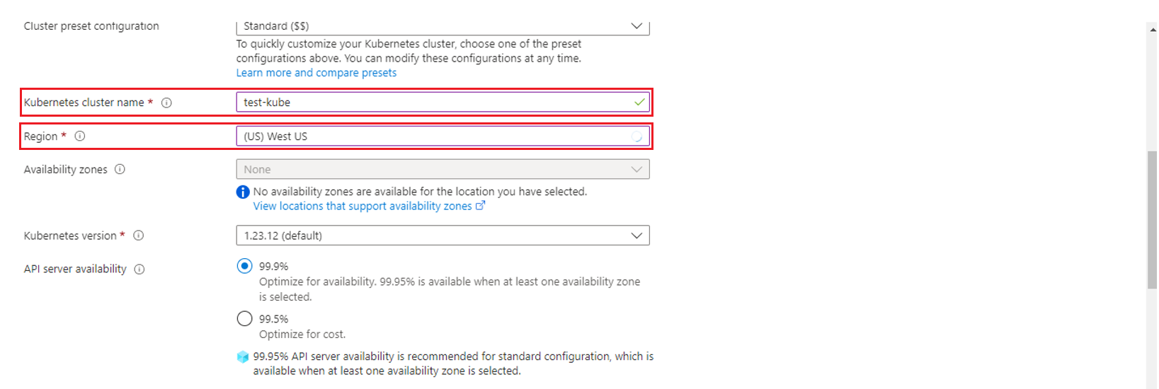Let the other options, Cluster preset configuration, Availability zones, Kubernetes version and API server availability remain as default.