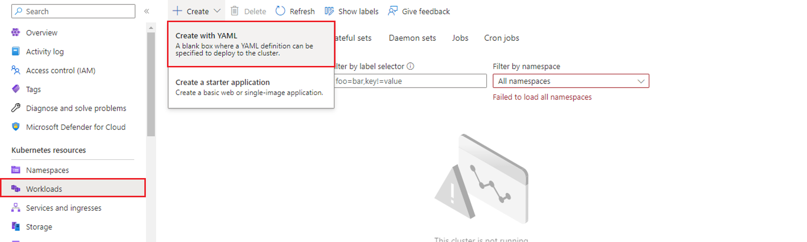Next, go to Workloads in your AKS cluster, click on the Create option and select the option Create with YAML as illustrated in the image below.