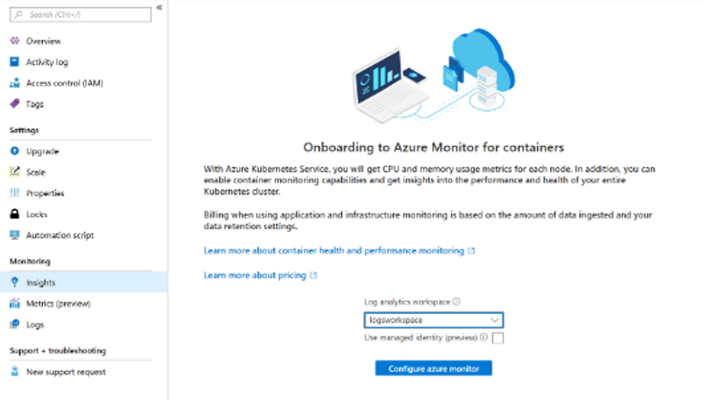 To enable monitoring directly from one of your AKS clusters in the Azure portal, do the following: