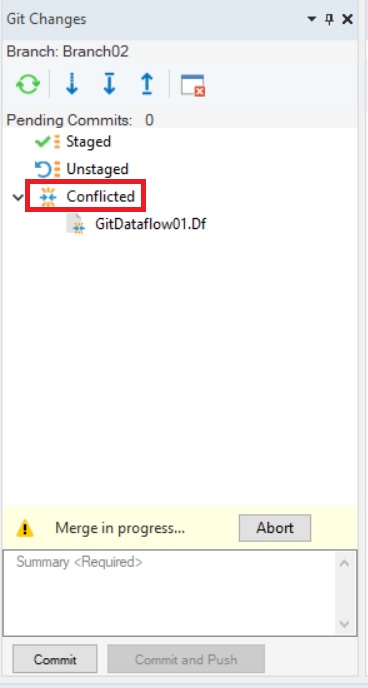 As you can see in the Git Changes Browser, a new node has appeared underneath Staged and Unstaged: Conflicted.