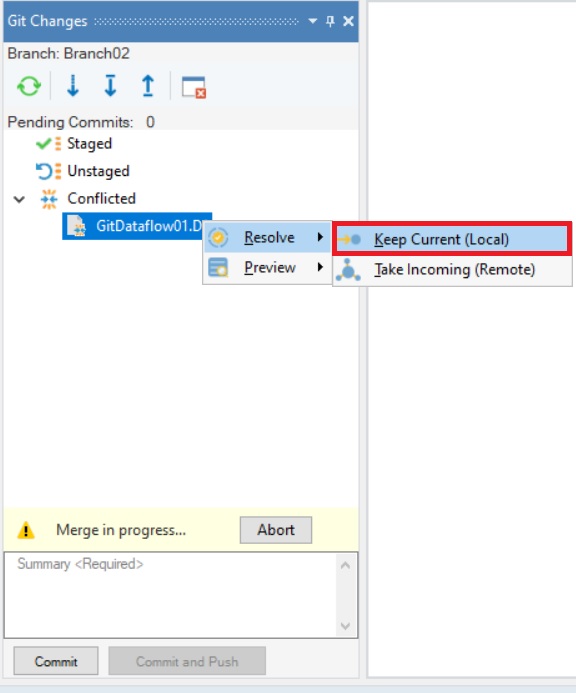 Take Incoming (Remote): Selecting this option will keep the conflicting file in the second branch and exclude the local one.