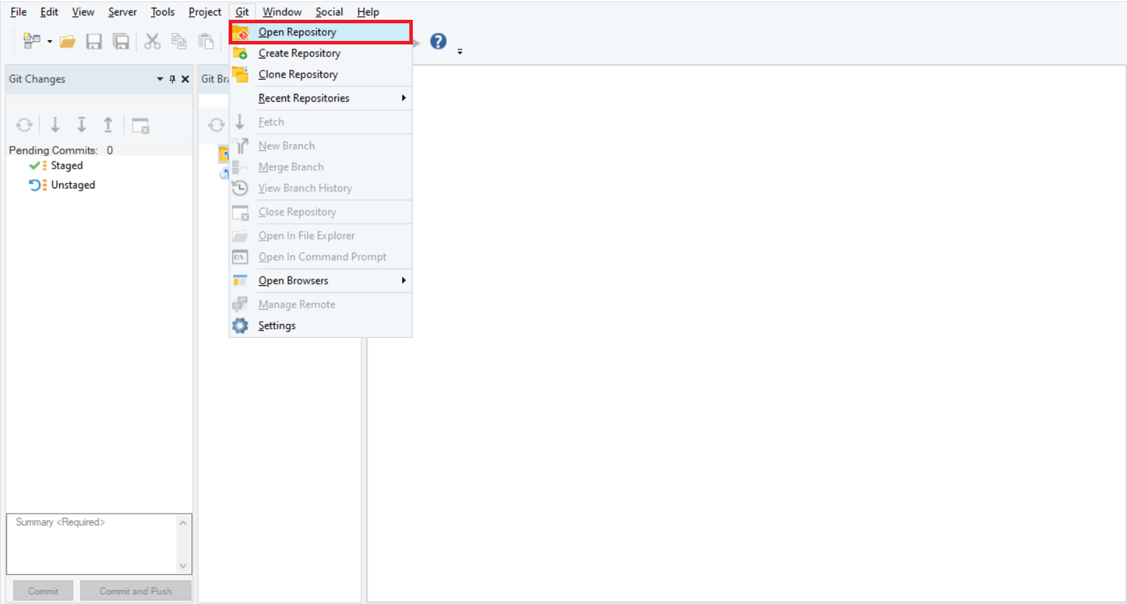 Open the local repository by clicking on Git in the main toolbar and selecting Open Repository from the drop-down menu.
