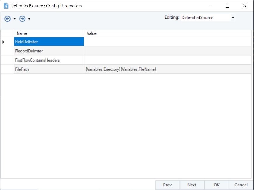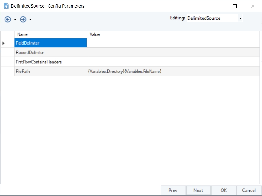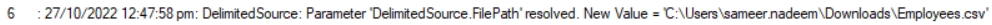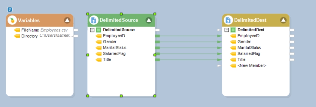 For this example, we have a simple flow that transfers data from a delimited source to a delimited destination. The FilePath for a Delimited File Source can be modified using parameters in the Config Parameters screen.